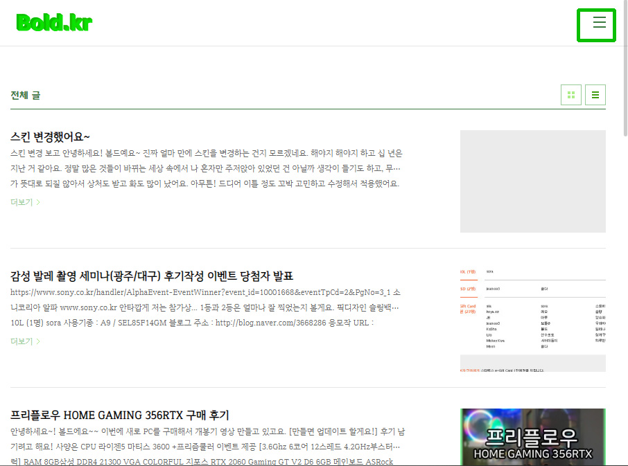임시로는 http://bold.kr/m 해서 모바일 페이지로 들어가면 스킨이 모바일로 바뀌면서 왼쪽 상단에 작은 3줄 클릭하면 메뉴가 나오는데요. 뭔가 번거로운 거 같네요.