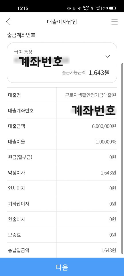 대출 이자는 어떻게 납입하는지 너무 궁금했는데, 문자로 알려주더라고요. 위에 사진에 보면 이자납기일이 나와있죠. 첫달은 1643원이 이자로 나왔네요. 대출 금액 600만원이 다 나오면 5천원정도 될건데 첫달은 궁금해서 어플로 대출이자납입 메뉴에서 직접 실행해봤어요. 계좌에 이자를 두면 자동으로 출금되니 잔고를 잘 확인해야겠어요.