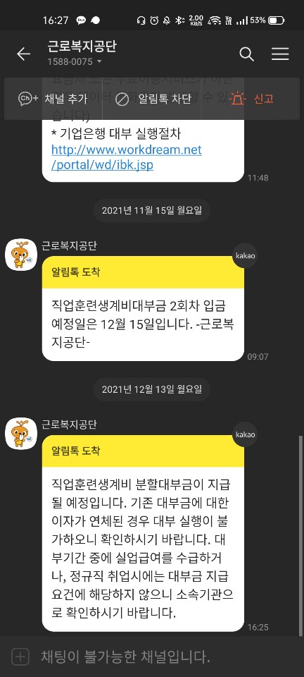 12일에 문자로 직업훈련생계비대부 신청서 처리결과 융자예정자로 선정되었습니다. 다음 절차인 신용보증대상 적격여부에 따라 근로복지공단 융자 및 보증지원 여부가 최종 결정됩니다라고 근로복지공단에서 알림톡이 왔어요.