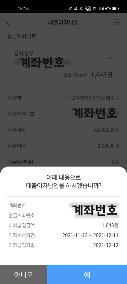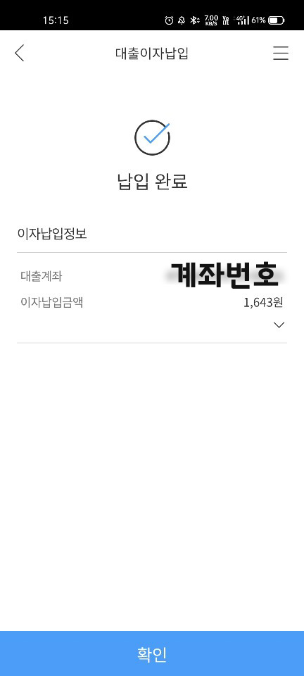 대출 이자는 어떻게 납입하는지 너무 궁금했는데, 문자로 알려주더라고요. 위에 사진에 보면 이자납기일이 나와있죠. 첫달은 1643원이 이자로 나왔네요. 대출 금액 600만원이 다 나오면 5천원정도 될건데 첫달은 궁금해서 어플로 대출이자납입 메뉴에서 직접 실행해봤어요. 계좌에 이자를 두면 자동으로 출금되니 잔고를 잘 확인해야겠어요.