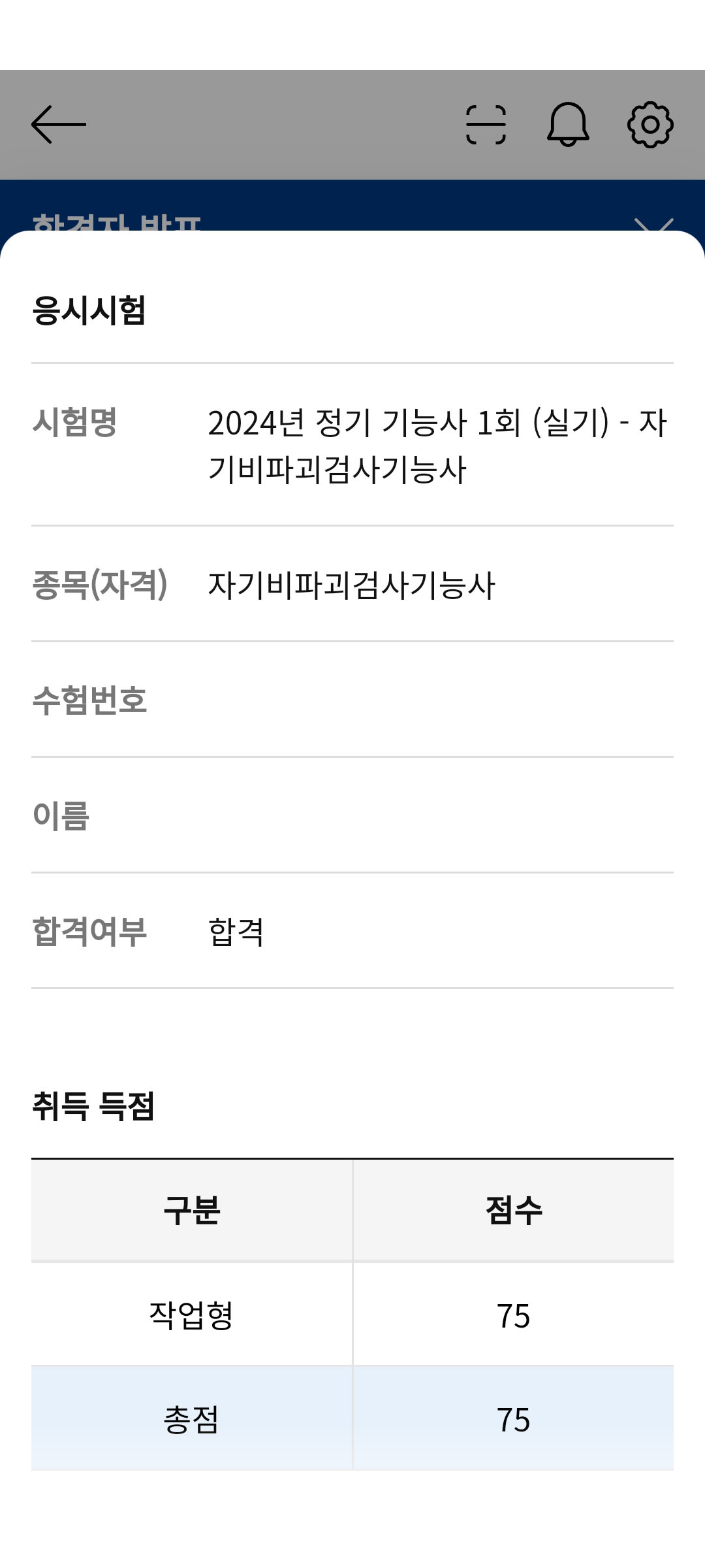 자기비피괴검사 실기 득점 조회