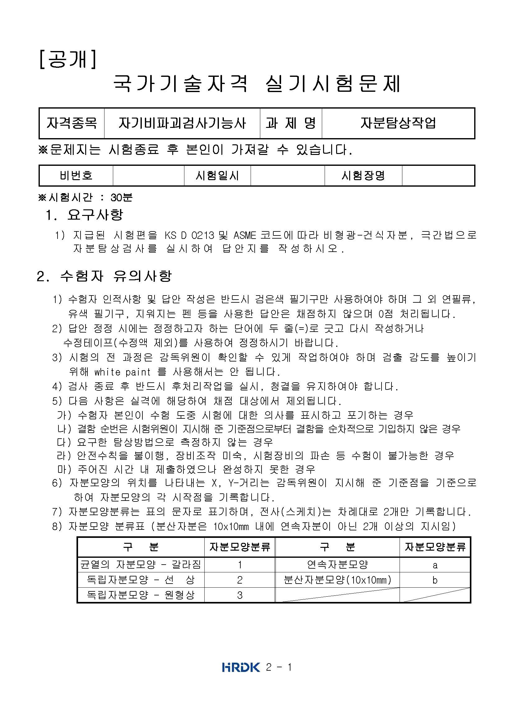 원형상 흠집을 1개가 잘 보이는데 다른 건 안 보여서 한참을 검사하다가 감독관에서 결함이 1개만 있을 수도 있냐고 물어보니, 당황하면서 1개만 있을 수도 있다고 했어요. pt때보다 결함 찾는 게 더 어려웠어요. 자분을 살살 뿌려도 두껍게 뿌려지는 거 같고, 건식 자분을 처음 써봐서 조절이 잘 안 됐어요. 이리저리 교차하면서 계속 검사해도 못 찾다가 조금만 더 해보고 안 되면 1개만 적고 나오자 생각하고 시간을 투자했어요. 그러다 드디어 x모양으로 된 결함 발견! 뒷정리하고 마지막조에서 제일 먼저 나온 거 같아요.