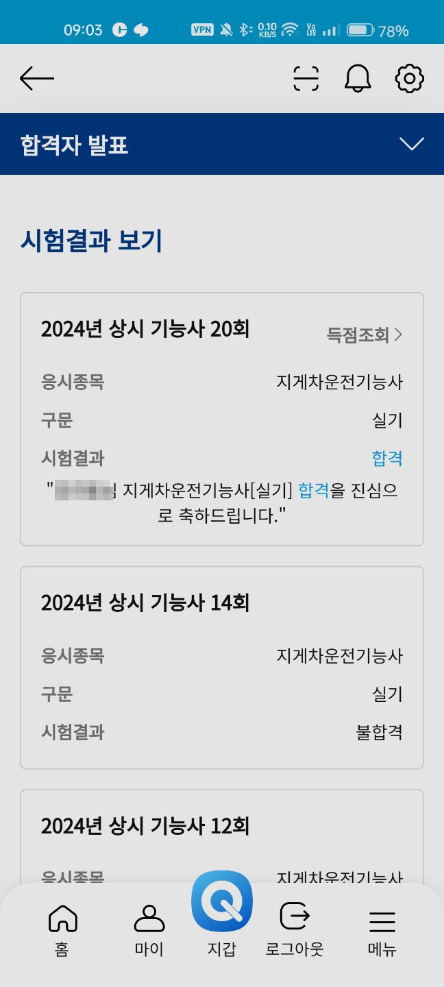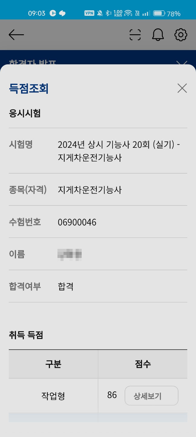 필기 70점, 실기 86점으로 최종 합격했고, 이후 건설기계조종면허까지 발급받았어요.